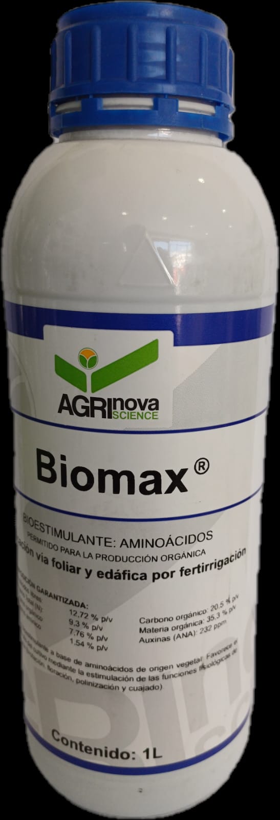 Biomax 1 L mejora la síntesis de proteínas, recuperación ante estrés y potencia el crecimiento en cultivos de rosas, flores, frutas y hortalizas. Apto para agricultura intensiva y orgánica, como complemento en fases críticas del cultivo.