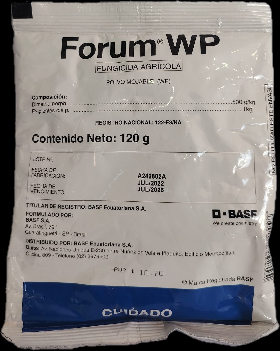 Fungicida sistémico en polvo mojable (WP) a base de dimethomorph, diseñado para prevenir y controlar enfermedades como mildiu, tizones y manchas foliares en cultivos exigentes.