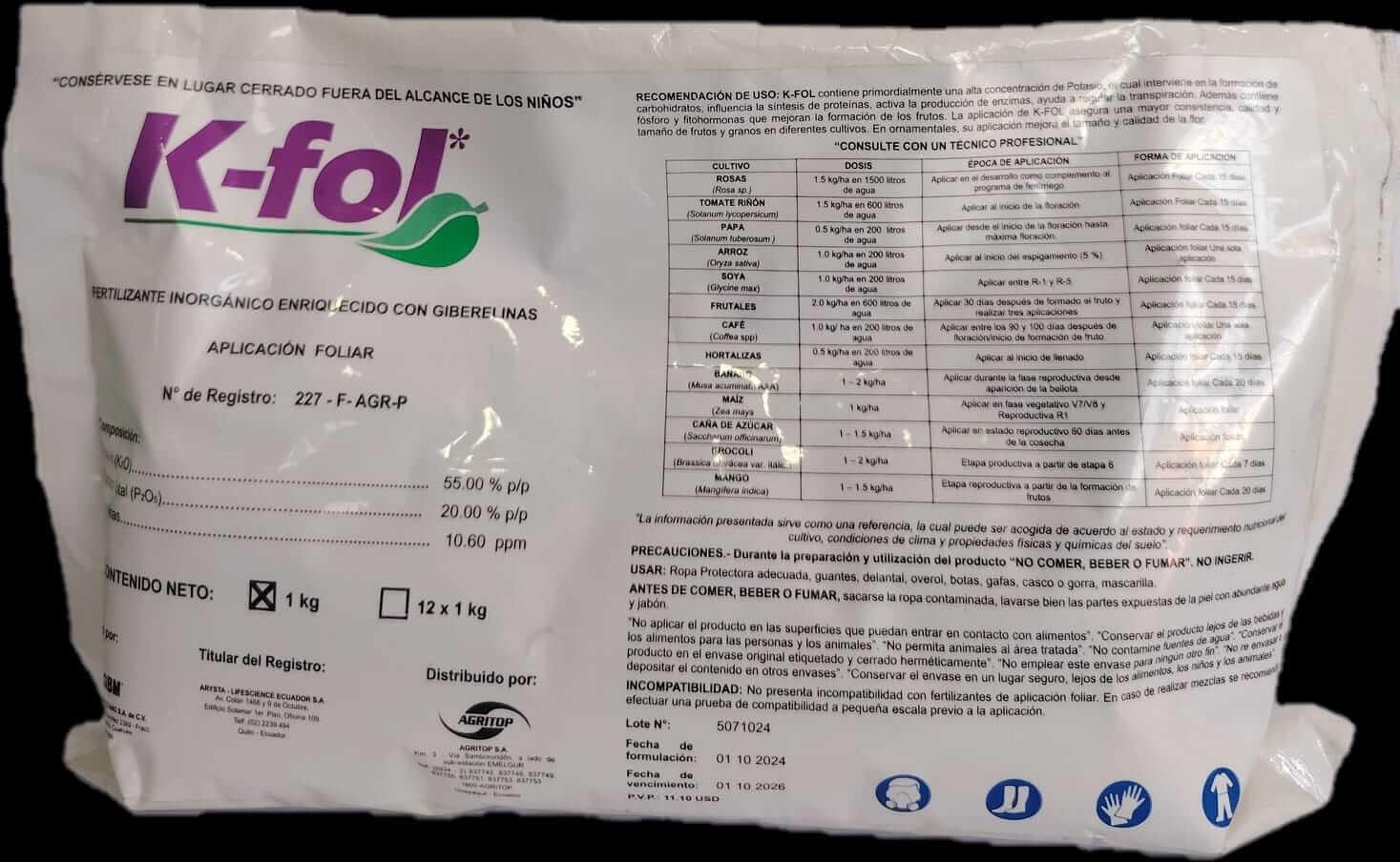 K-fol potencia la formación de flores y frutos, mejora la calidad y favorece el transporte de azúcares, siendo ideal para rosas, frutales, hortalizas y flores de exportación. Se recomienda en etapas de floración, cuajado y maduración.