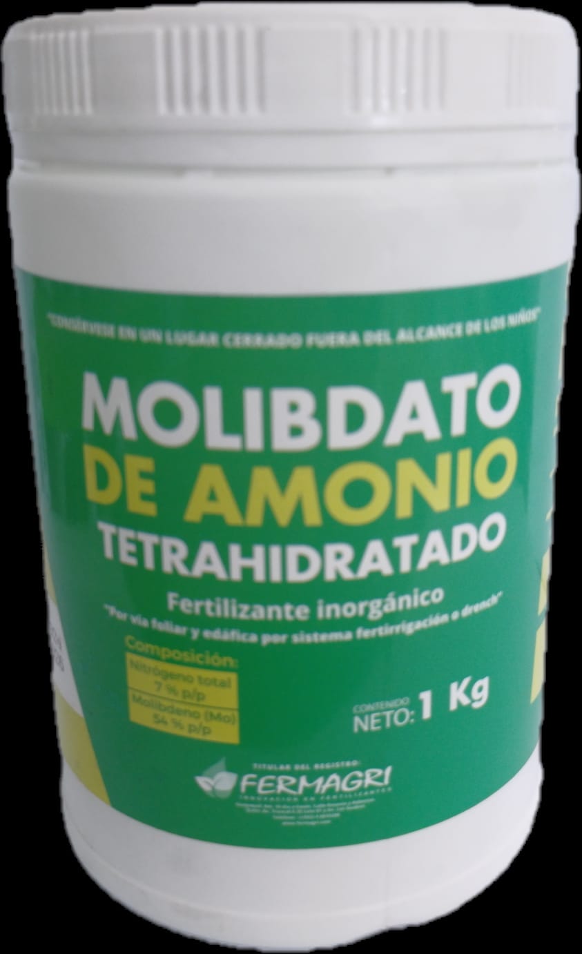 Molibdato de Amonio Fermagri 1 kg es ideal para leguminosas, flores, frutales y hortalizas, especialmente en suelos con bajo contenido de Mo. Ayuda a prevenir deficiencias nutricionales que afectan el rendimiento del cultivo.