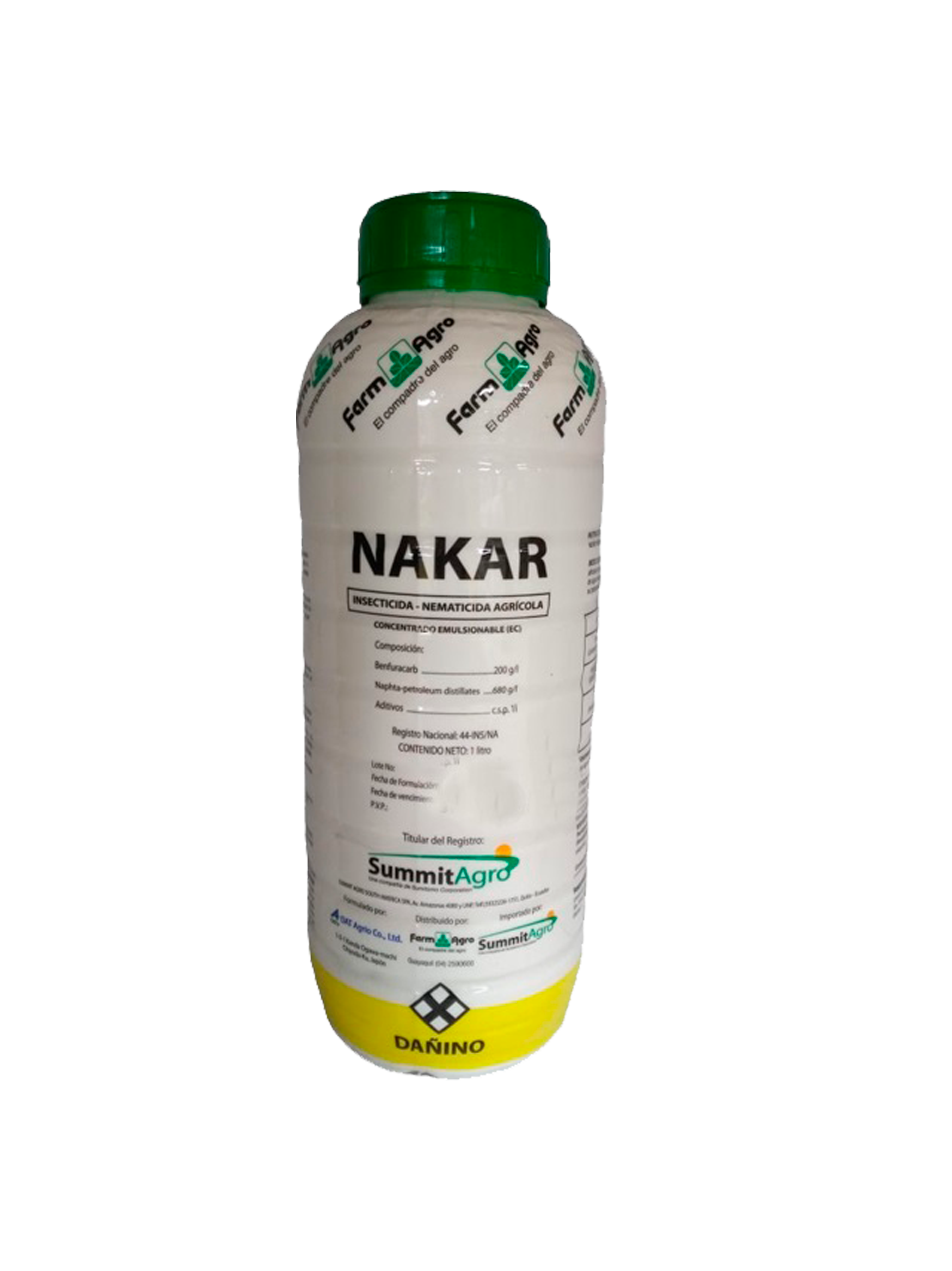 Insecticida-nematicida de amplio espectro a base de benfuracarb, diseñado para el control de plagas del suelo como nematodos, gusanos y larvas radiculares. Nakar actúa de manera sistémica y prolongada, protegiendo la zona de raíces en cultivos de rosas, ornamentales, hortalizas y frutales. Ideal para aplicaciones preventivas y en suelos con antecedentes de infestación, mejorando el establecimiento y vigor de las plantas.