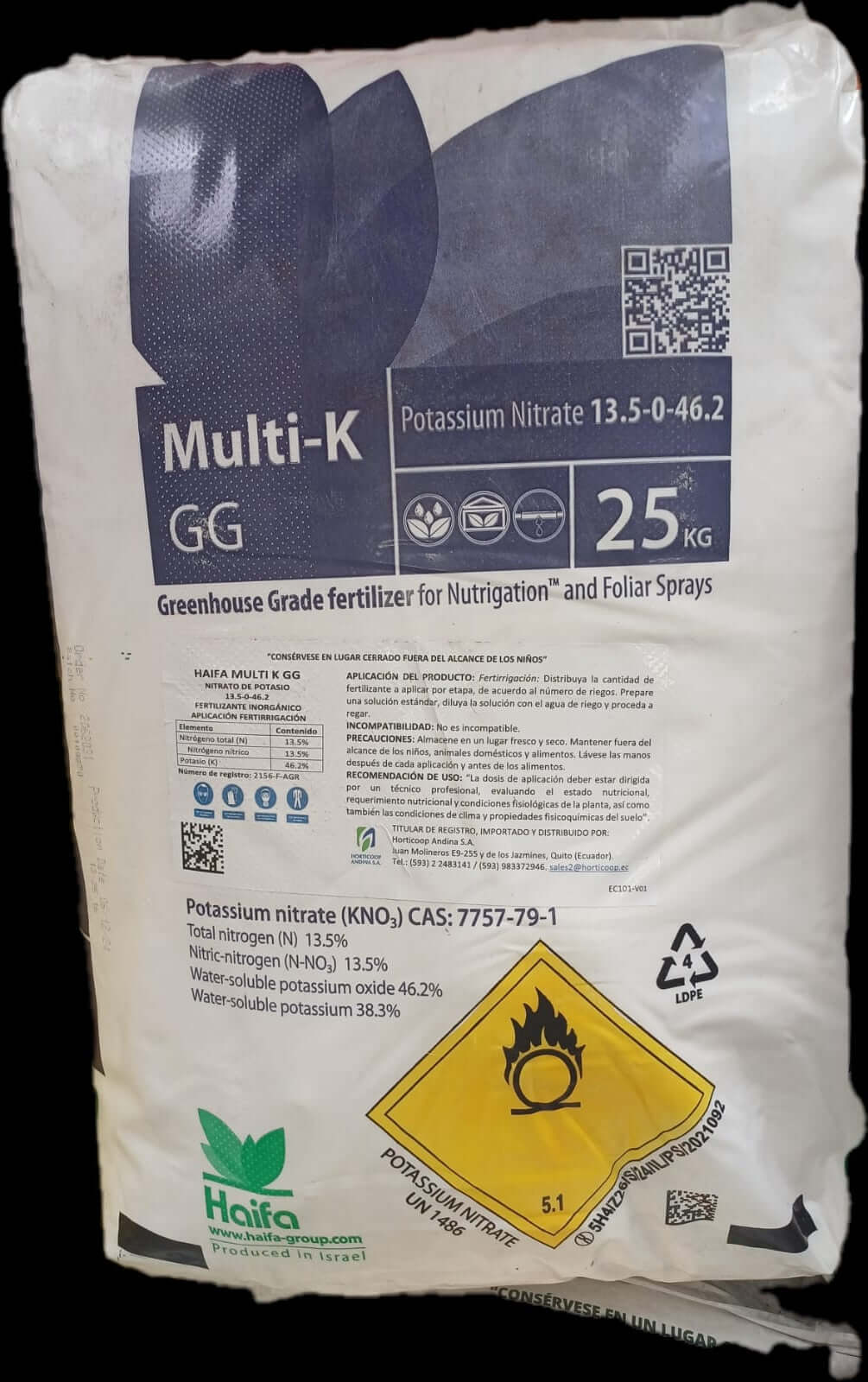 Fertilizante hidrosoluble a base de nitrato de potasio, ideal para aportar nitrógeno y potasio altamente disponibles, esenciales para el desarrollo vegetativo, la floración y la formación de frutos.
