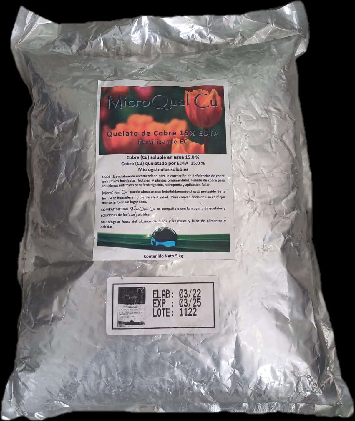 Fertilizante soluble con cobre quelatado, formulado para prevenir y corregir deficiencias de cobre en cultivos agrícolas.