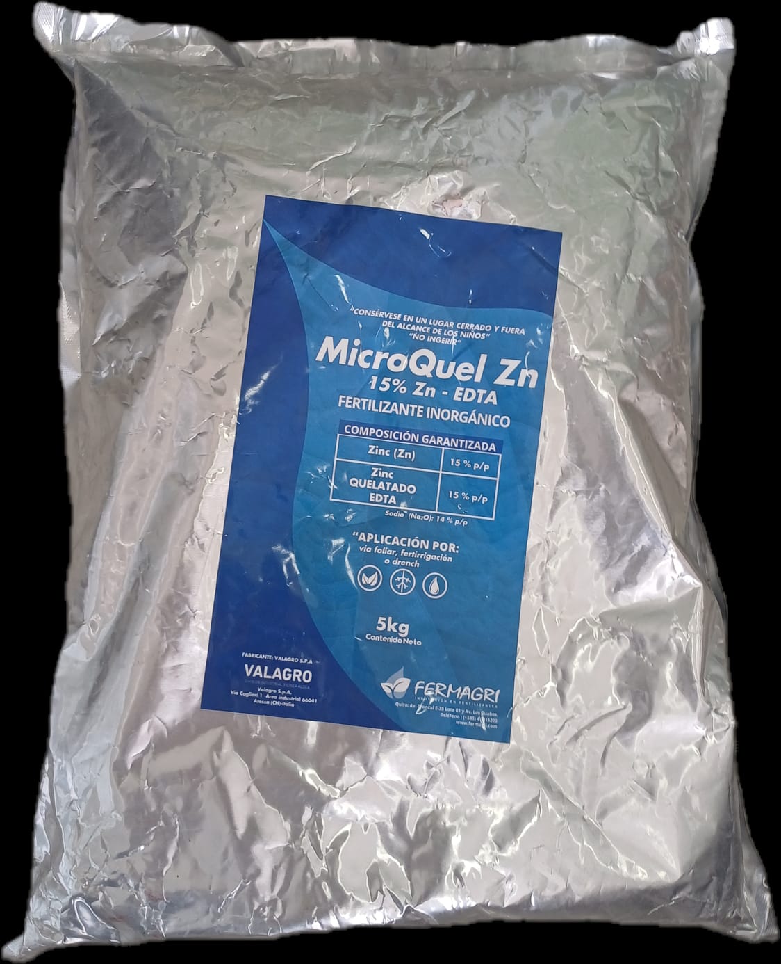 Quelato de zinc EDTA (MicroQuel Zn) con 15% de Zn totalmente soluble, formulado para corregir carencias de zinc y promover un desarrollo vegetal equilibrado.