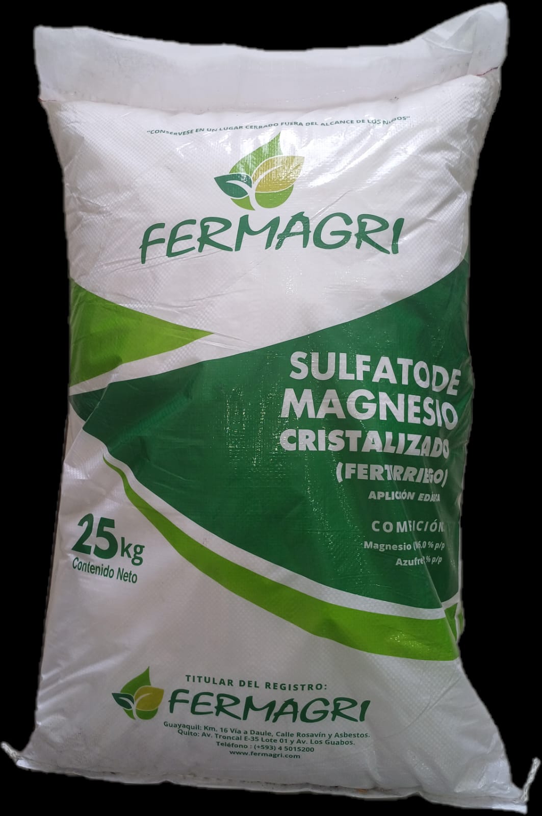 Fertilizante soluble a base de sulfato de magnesio, diseñado para suplir los requerimientos de magnesio en cultivos exigentes, mejorando la formación de clorofila, fotosíntesis y vigor foliar. Sulfato de Magnesio Fermagri 25 kg es ideal para rosas, frutales, hortalizas y cultivos ornamentales, especialmente en suelos deficientes en magnesio o en etapas de alto consumo del nutriente.