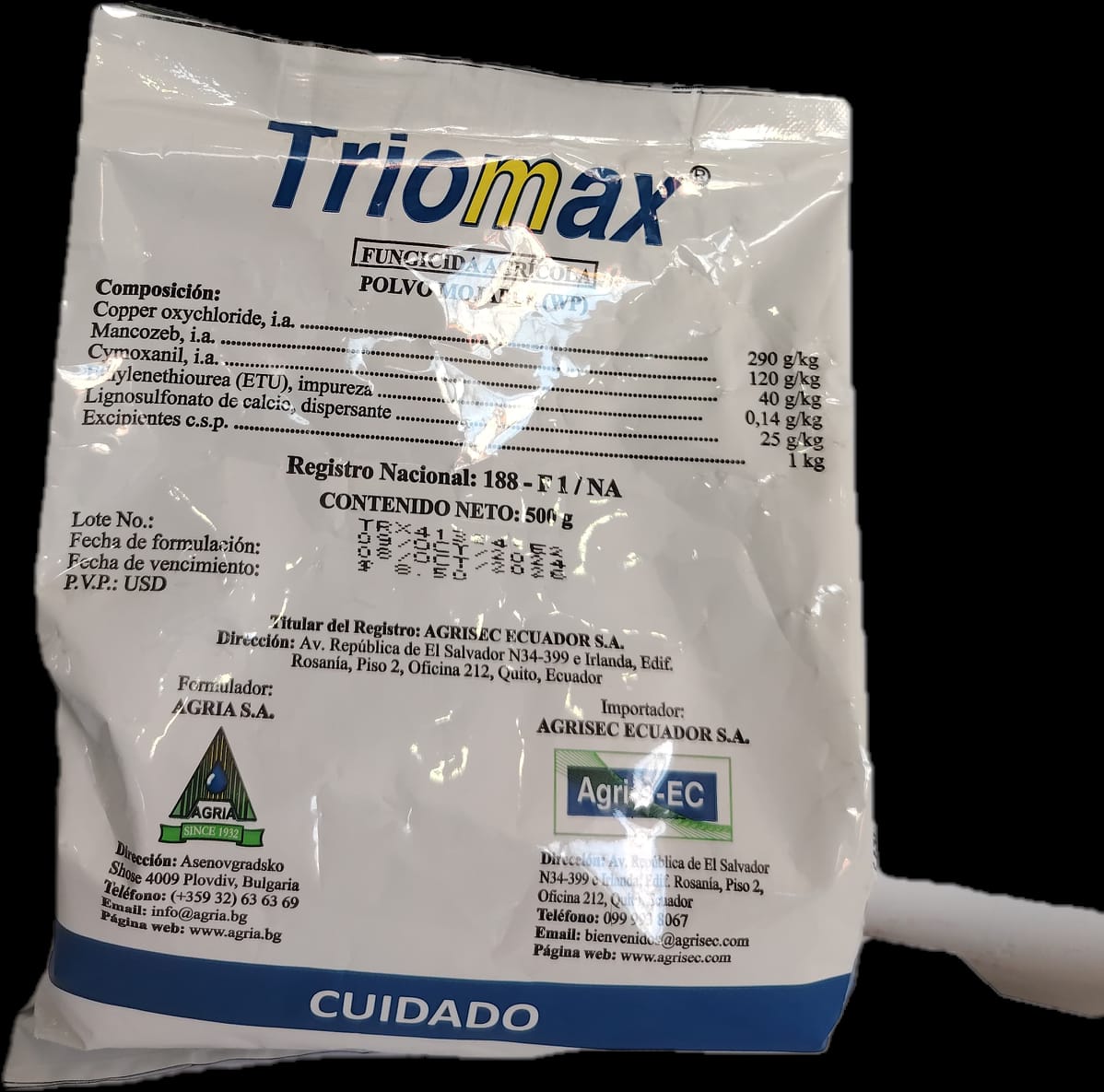 Fungicida sistémico y de contacto a base de oxicloruro de cobre, ideal para el control preventivo de enfermedades fúngicas y bacterianas. Triomax ofrece acción protectora prolongada y es apto para su uso en rosas, ornamentales, hortalizas y frutales, ayudando a mantener la sanidad del cultivo frente a manchas foliares, bacteriosis y mildiu. Compatible con programas de manejo integrado.