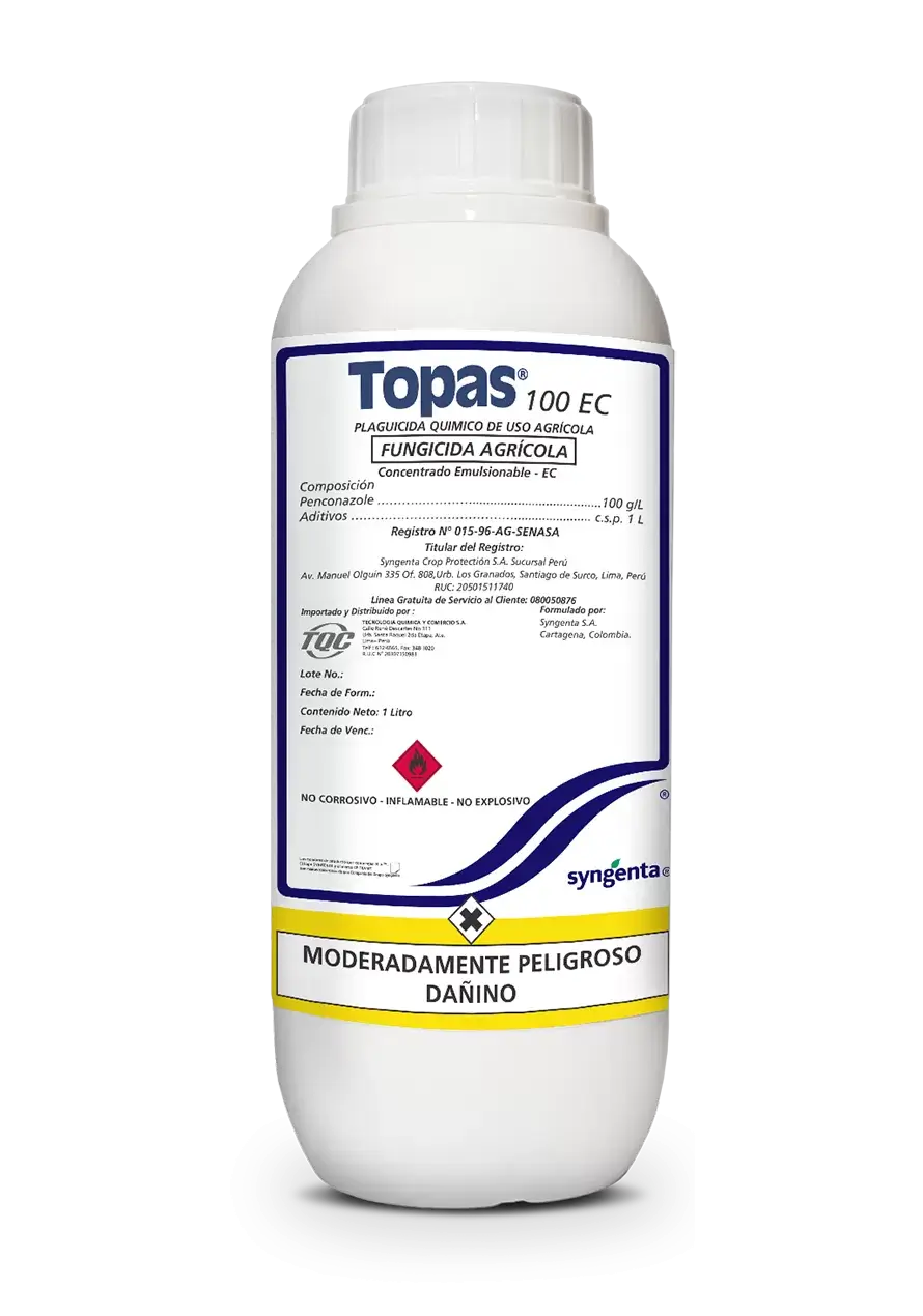 Fungicida sistémico a base de penconazole, especialmente formulado para el control efectivo de enfermedades foliares como oídio, cenicilla, antracnosis y manchas, ofreciendo acción preventiva, curativa y protectiva. Topas 1 L penetra rápidamente en los tejidos vegetales, proporcionando protección prolongada en rosas, ornamentales, frutales y hortalizas, incluso en condiciones de alta presión fúngica.